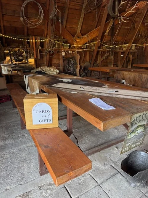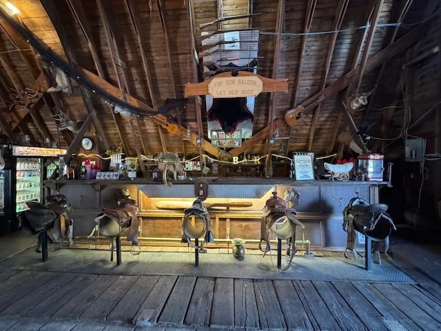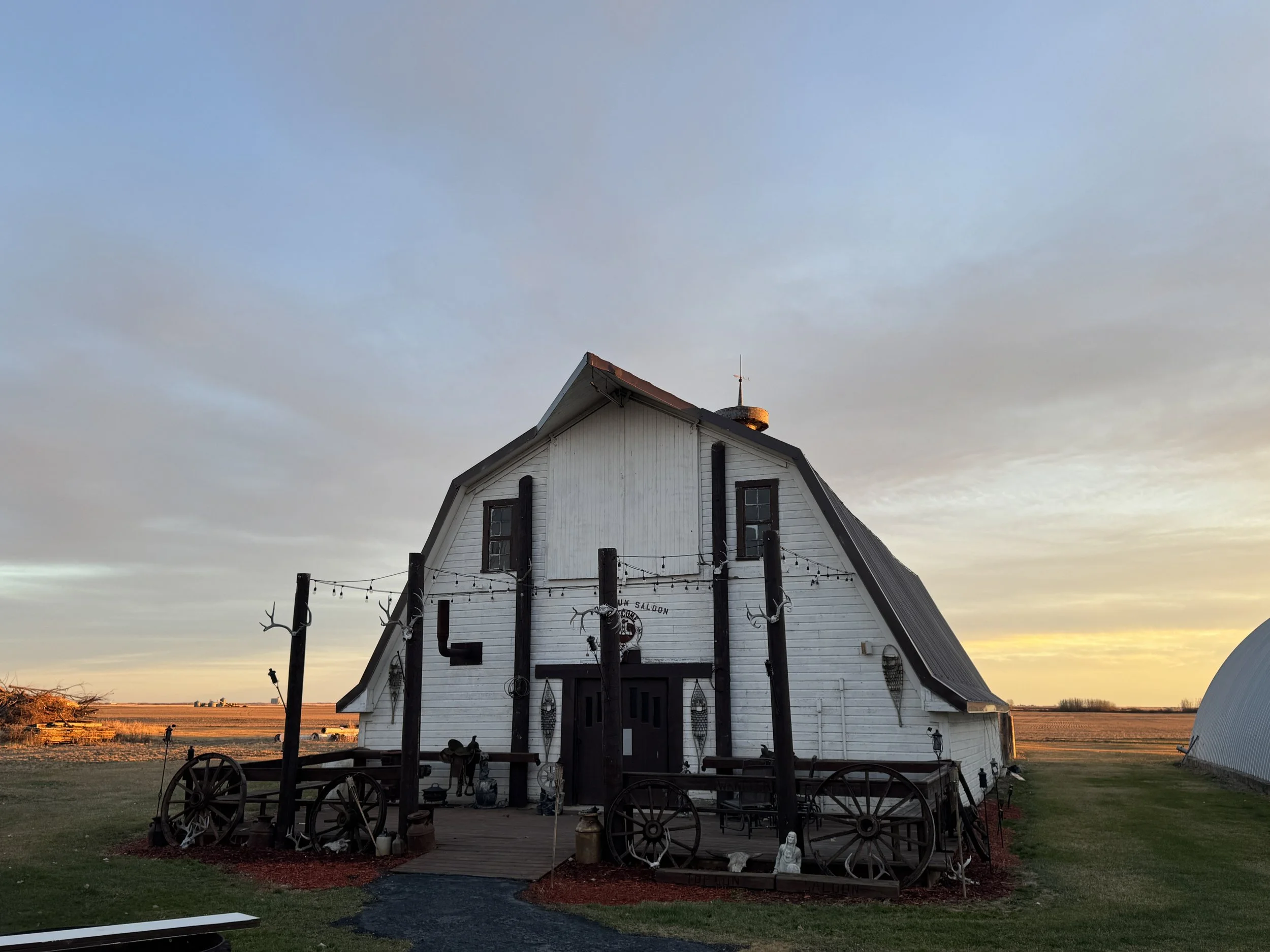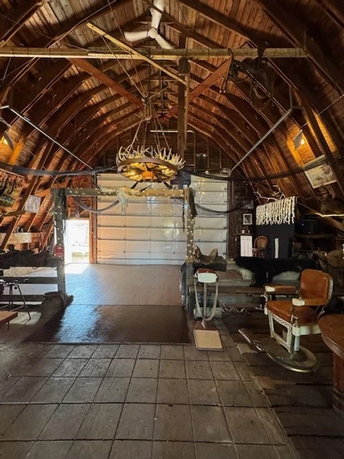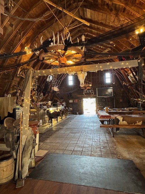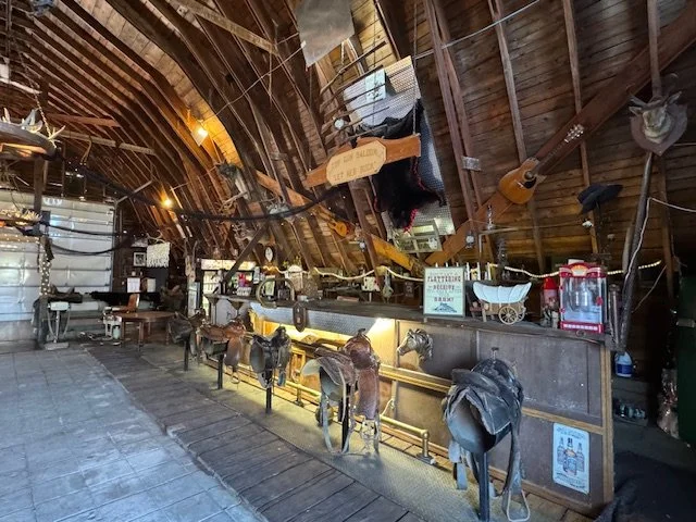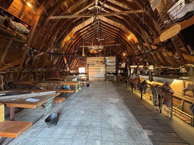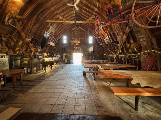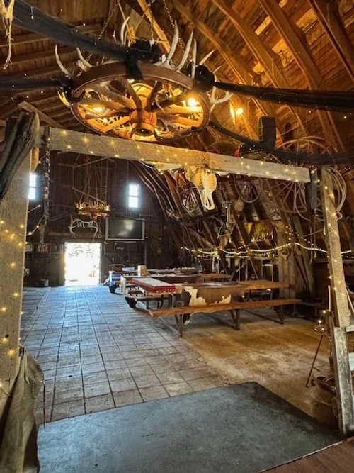 Built in 1928, this charming barn features a dance floor and a vintage collection of unique antiques and collectibles. The space is thoughtfully furnished with homemade tables and bar stools made from saddles, adding to its rustic, one-of-a-kind appeal.
